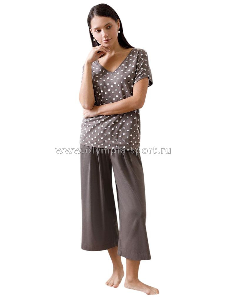 Свободная футболка кофейного цвета с V-вырезом и цельнокроеным рукавом из натурального 100% хлопка создает красивый и легкий образ для дома и отдыха. Дышащая ткань бережно заботится о коже, в то время как декольте с V-вырезом утонченно подчеркивает линию шеи, а свободный крой скрывает возможные недостатки фигуры. Трендовый принт в виде лапок добавляет повседневной футболке оригинальности и актуальности для любой домашней обстановки. Такая футболка отлично подойдет для тех, кто ценит комфорт и стиль одновременно. Благодаря натуральной хлопковой ткани, она идеально подходит для ежедневного использования, обеспечивая чувство легкости и свободы движений. Легкая структура материала поддерживает оптимальный микроклимат, что важно при длительном использовании. Эта футболка женственно смотрится и дарит ощущение уюта, делая ее необходимым элементом домашнего гардероба.