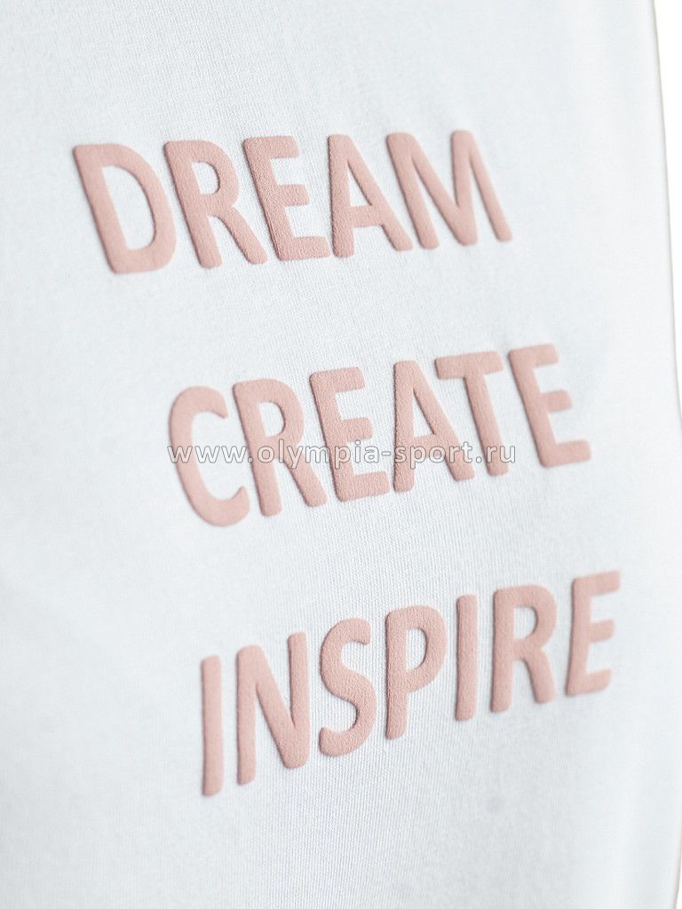 Перевод принта: Dream, create, inspire — мечтай, создавай, вдохновляй. Футболка из премиального хлопка, высокое качество хлопковых волокон обеспечивает комфорт в любое время года. Горловина выполнена из рибаны в тон изделия, Рукава с подворотами и золотистым логотипом бренда. Авторский принт нанесен фактурными красками с устойчивым покрытием. За счет эластана в составе идеально держит форму и сохраняет внешний вид в течение долговременного использования. Универсальная вещь для ваших стилистических решений.